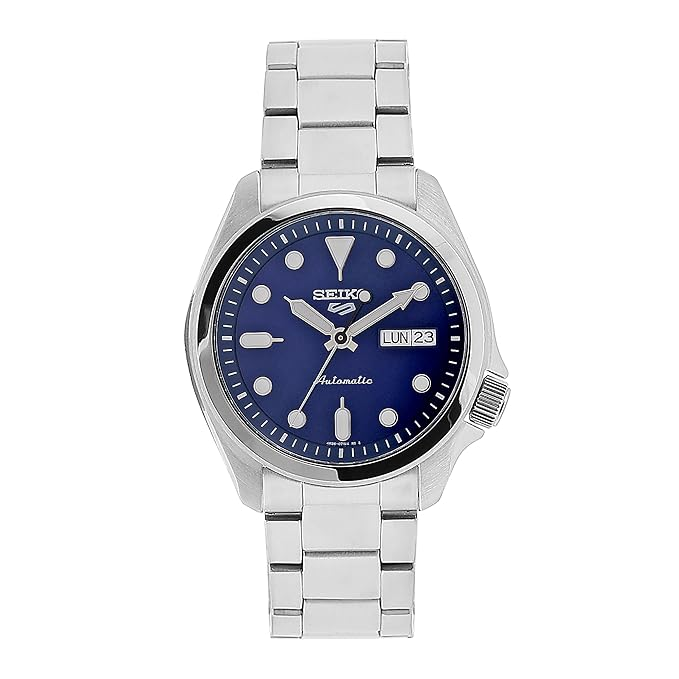 Alt text: "Seiko 5 SRPE automatic watch with blue dial and stainless steel bracelet"