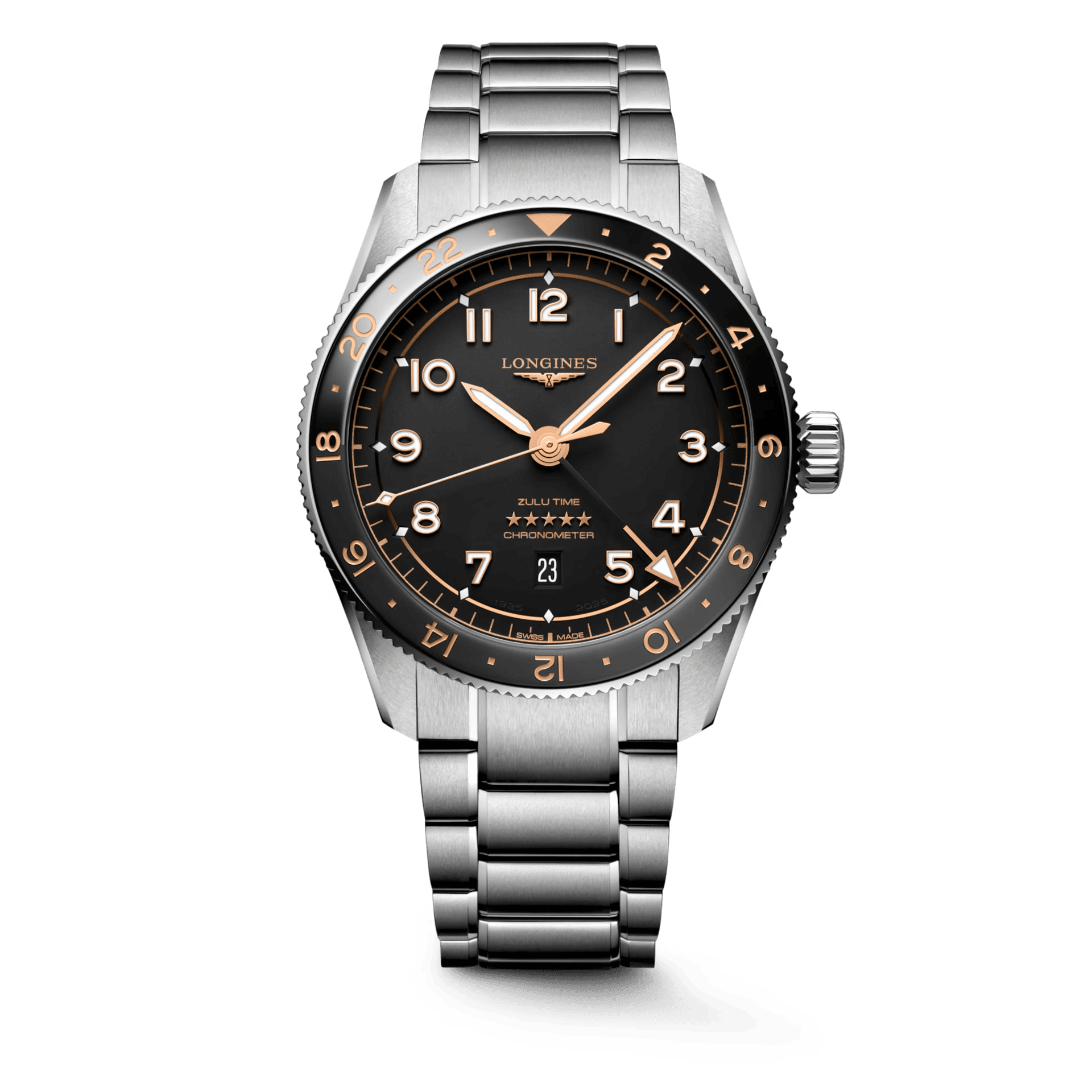 The Zulu Time is named after the original dual-timezone Longines wristwatch from 1925 — the one that featured the Zulu flag, with "Z" designating universal time for aviators. The modern version lives up to that heritage with a COSC-certified GMT movement and a bidirectional ceramic bezel.