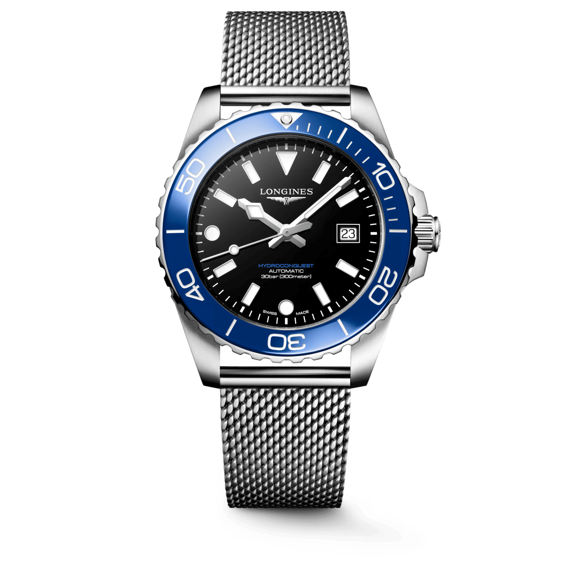 Alt text: "New 2026 Longines HydroConquest 39mm with blue ceramic bezel and Milanese bracelet"