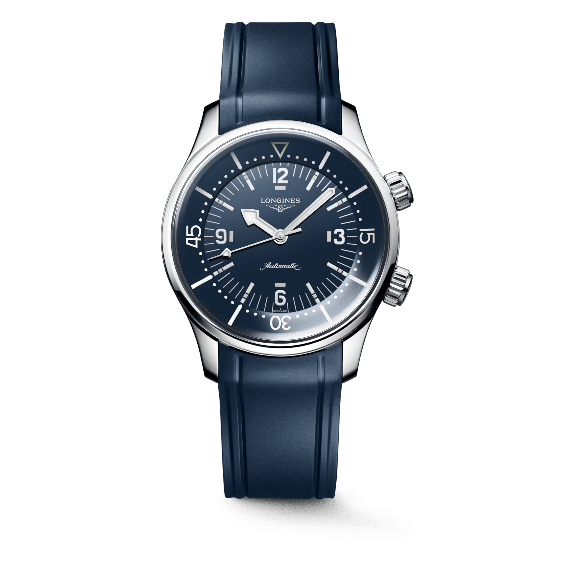 The Legend Diver is Longines' tribute to its own 1960s diving watch heritage. It features an inner rotating bezel operated through the crown — a mechanism that was innovative in the original and remains distinctive today.